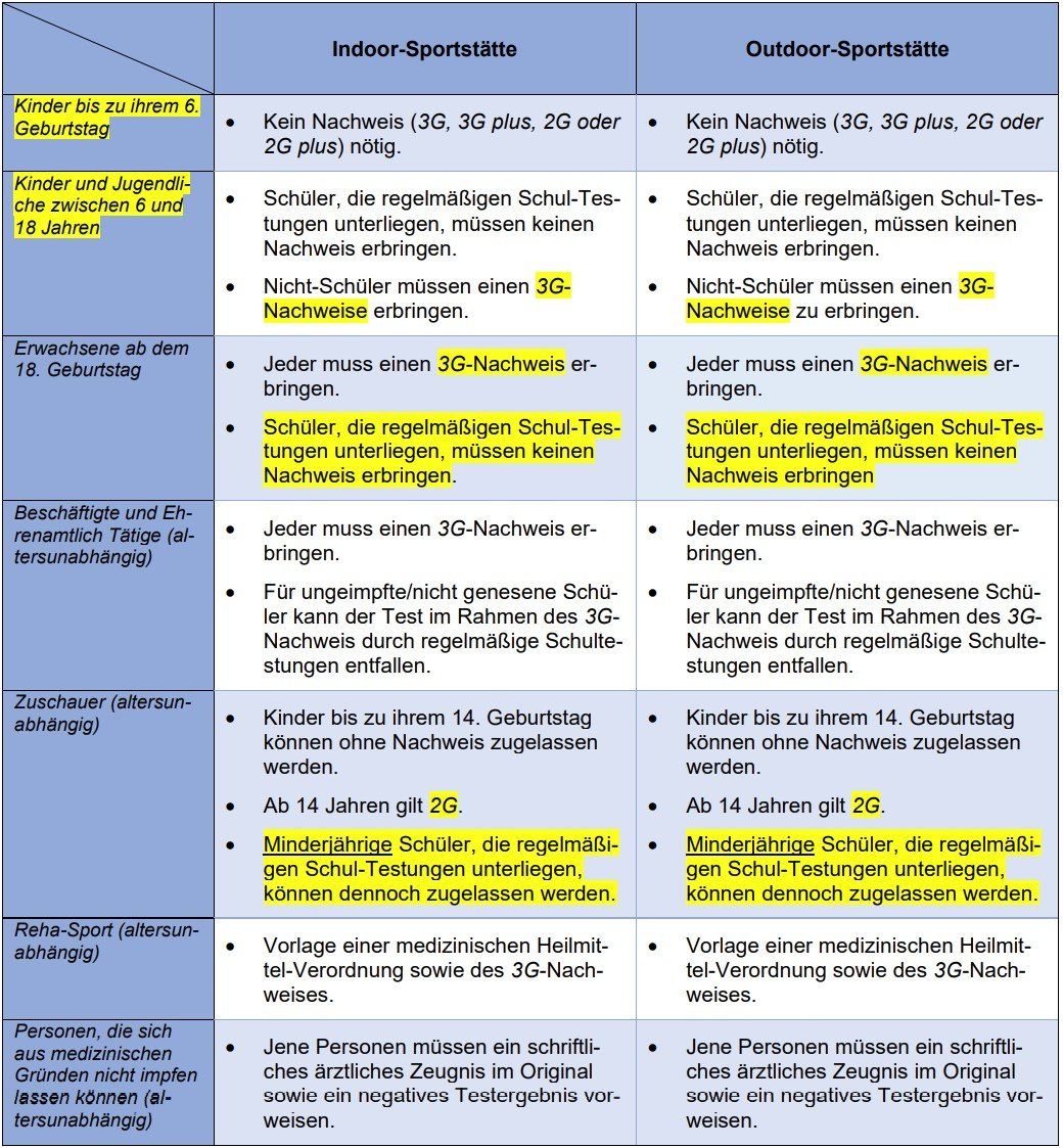 Bei 3G ist der Zugang zur eigenen aktiven sportlichen Betätigung (in Outdoor- und Indoor-Sportstätten sowie Fitnessstudios, Tanzschulen, Reha-Sport, etc.) für folgende Personen möglich: